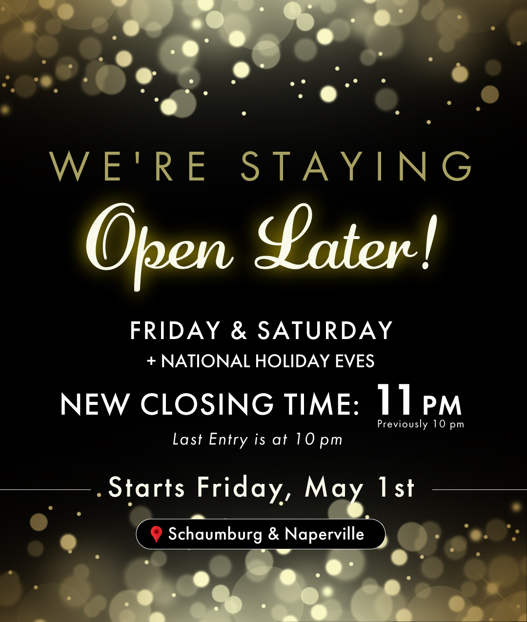 In addition to every Friday and Saturday, these extended hours will also apply to the evenings of National Holidays. Now you can kick off your long weekends with a late-night celebration!