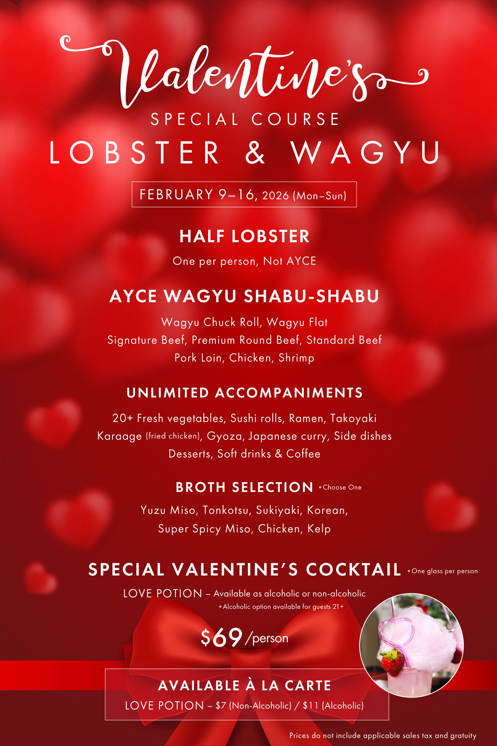 For a limited time, we are offering our Valentine’s Course, featuring an AYCE Signature Wagyu Shabu-Shabu experience with lobster and a special drink, designed for couples and special occasions.